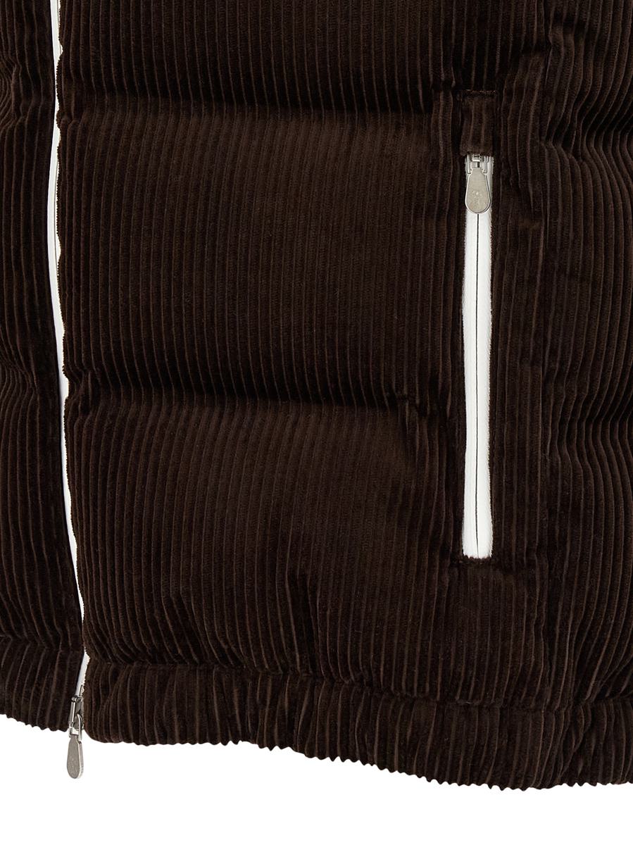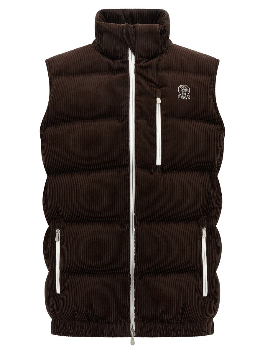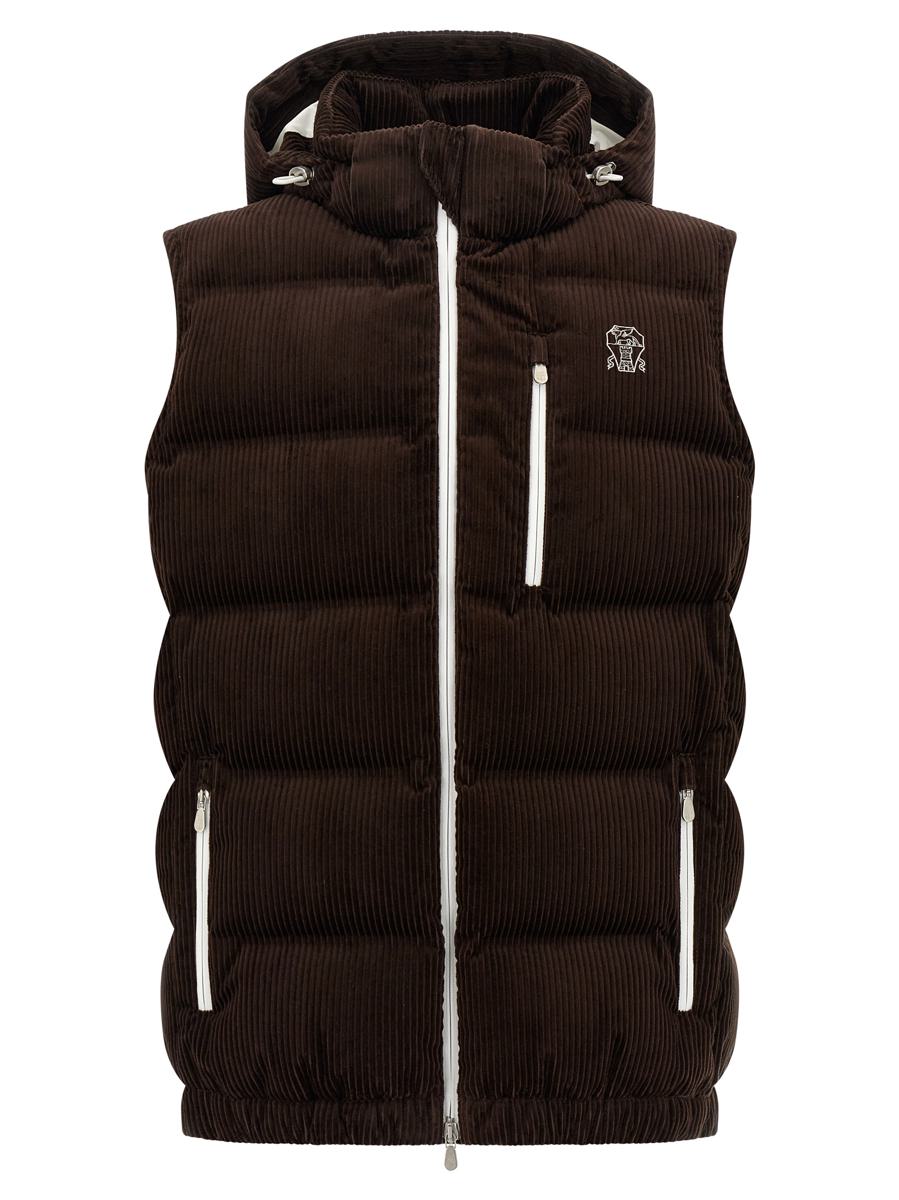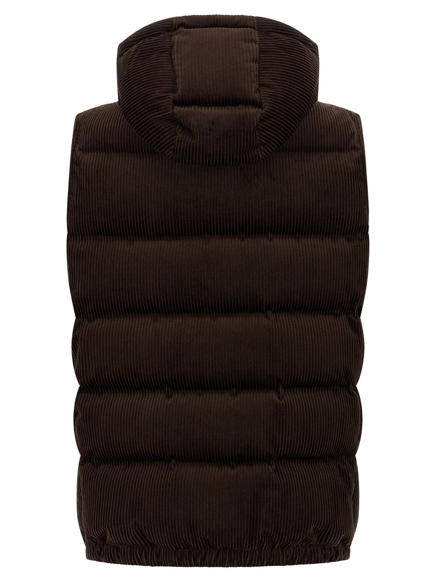 Water-repellent quilted corduroy vest, goose down padding, logo embroidery and front zip closure, adjustable and removable hood, standing collar, pockets, elastic hem, nylon lining